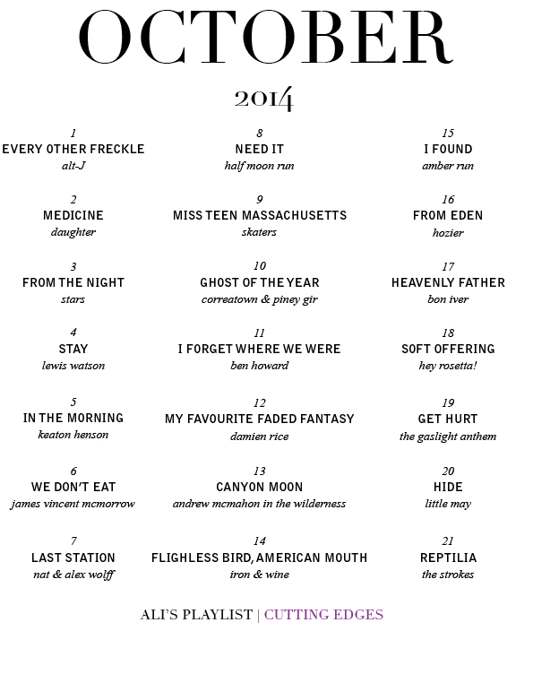 October is a wonderful time of year. It’s not too cold that you cringe when you step out the door, nor is it too hot that you can’t sport those lovely wool sweaters. For us Canadians, thanksgiving is in october, and it’s perfect apple picking season. Basically, it’s the coziest season. This month’s playlist stays true to the feelings of october with a large variety of singer/songwriters, indie and folk artists. They will surely fit into the comfort of october! Enjoy!