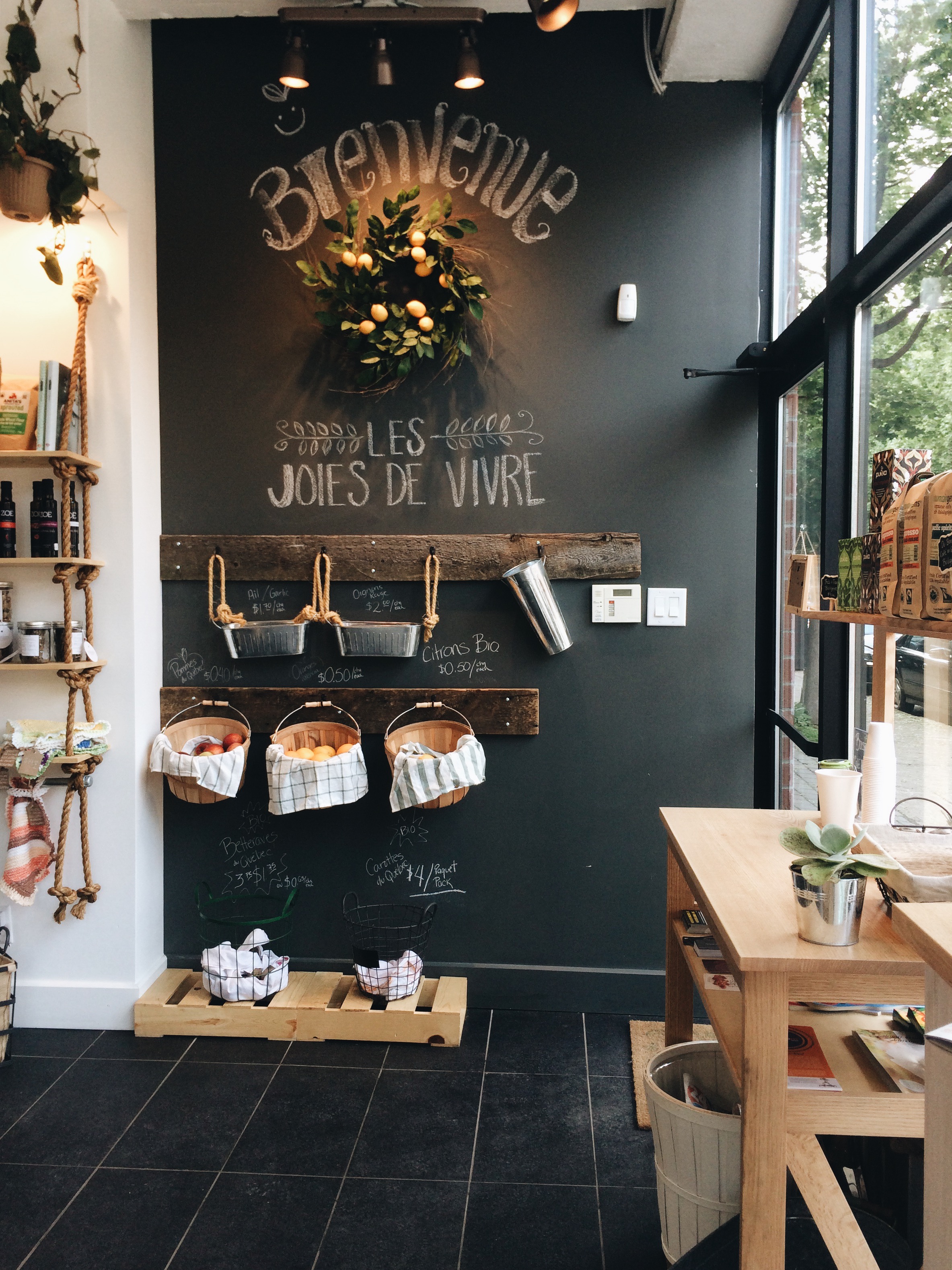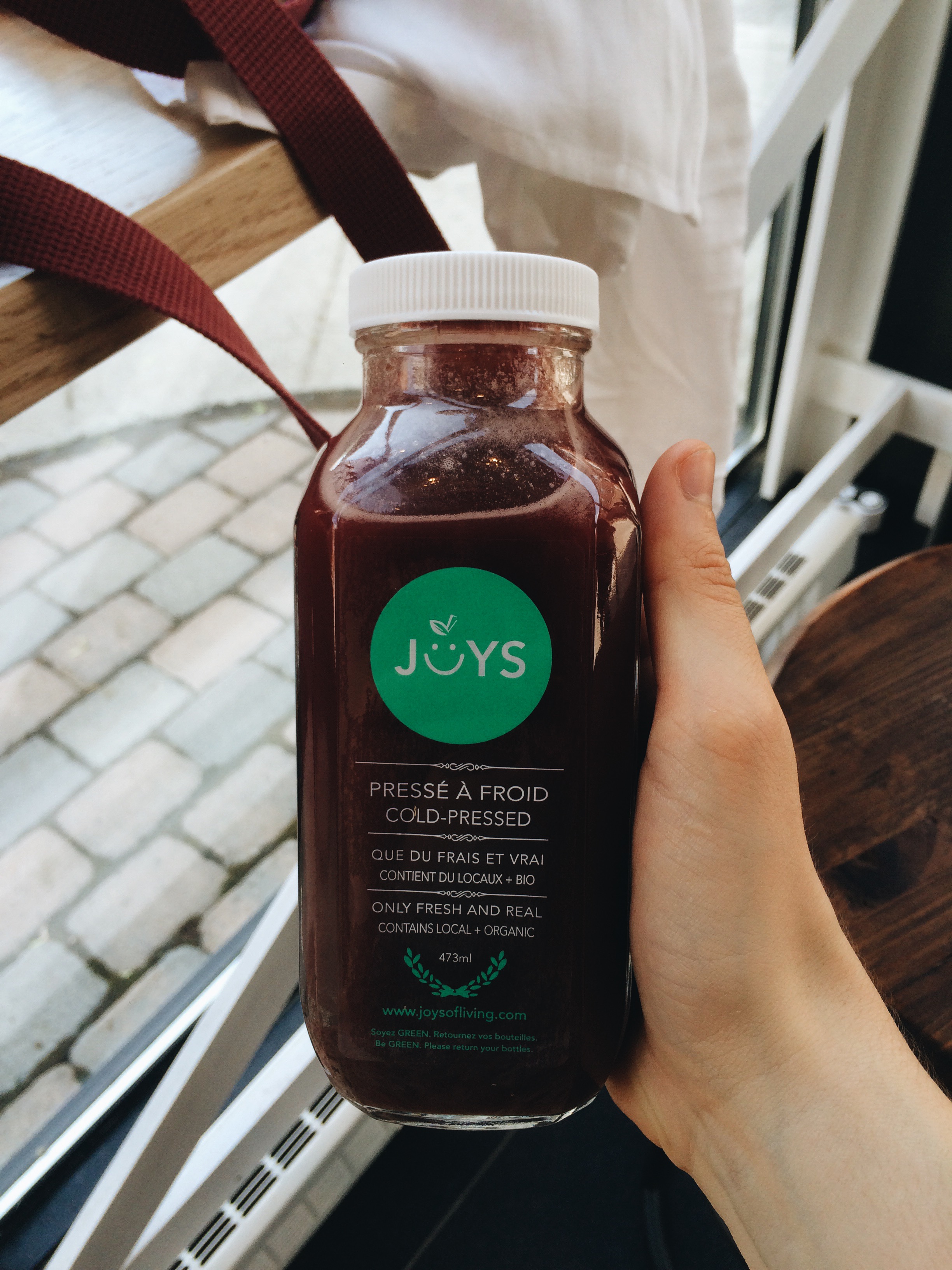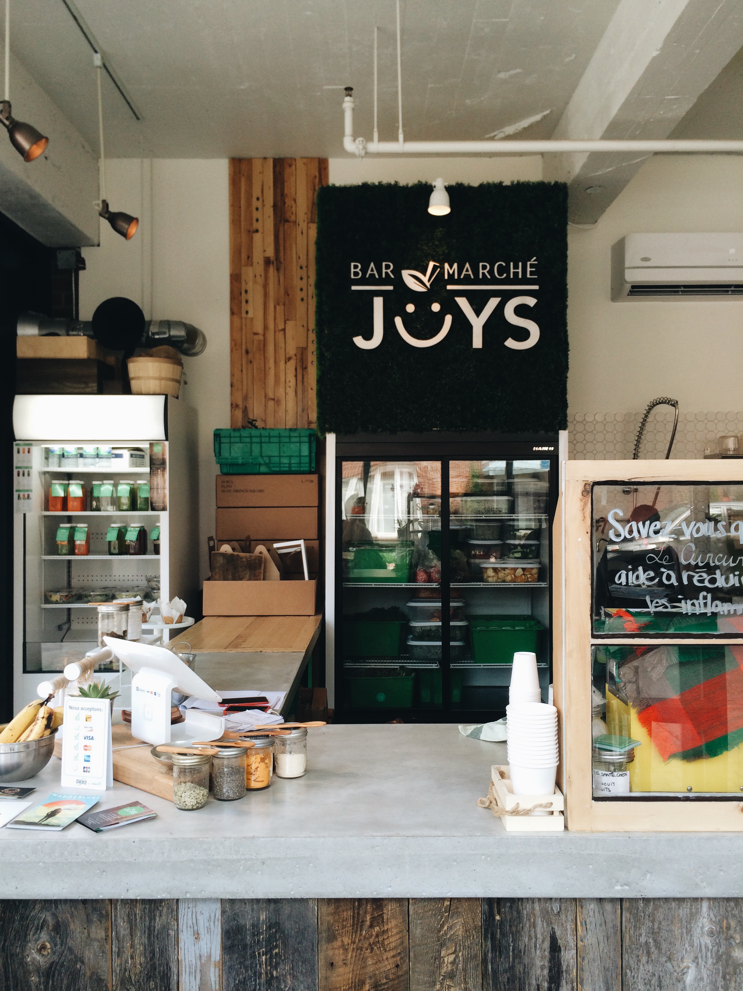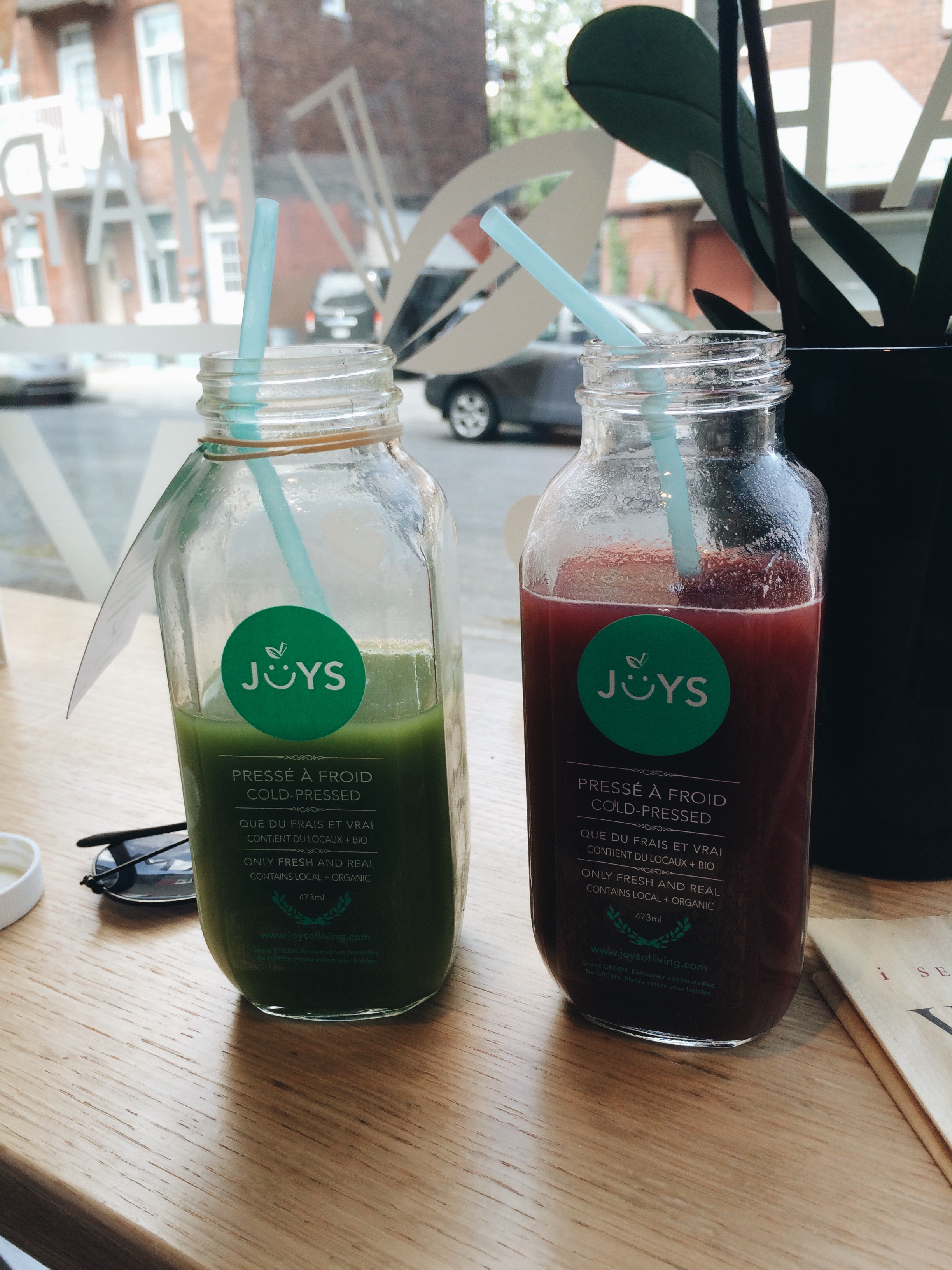 This past week, Tia and I ventured out to the St-Henri located juice and health bar of Joys of Living to test out their juices. This Montreal-born company had been selling healthy juices and juice-cleanse plans via their website for quite some time before setting up shop on the corner of St-Philippe and St-Antoine. The bar opened in April, and since then has done very well for itself. Cute decor, and a wonderful mantra advocating, essentially, the joys of living.